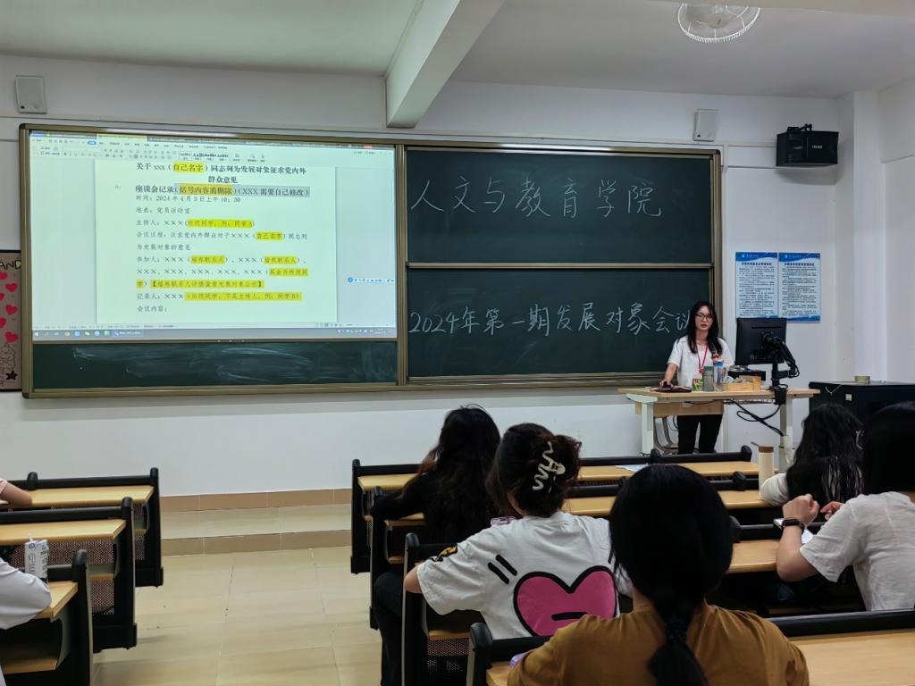 会议开始,王倩老师首先对被选为发展对象的同学表示祝贺,同时也强调各位学员要在此次的培训中要思考“为什么想入党”,坚定理想信念,端正入党动机;要感悟思想伟力,强化理论武装,锤炼坚强党性。希望各位发展对象能在会议后更加深刻地理解党员的责任和使命,以“学思践悟”促“知行合一”,不断提升自身的党性修养,争取早日入党。随后,党务工作人员朱逸璇,深入浅出的为各位发展对象讲解相关培训内容,包括政审材料的填写,以及为发展对象解答问题,引导发展对象更好的了解了自身的职责和使命。