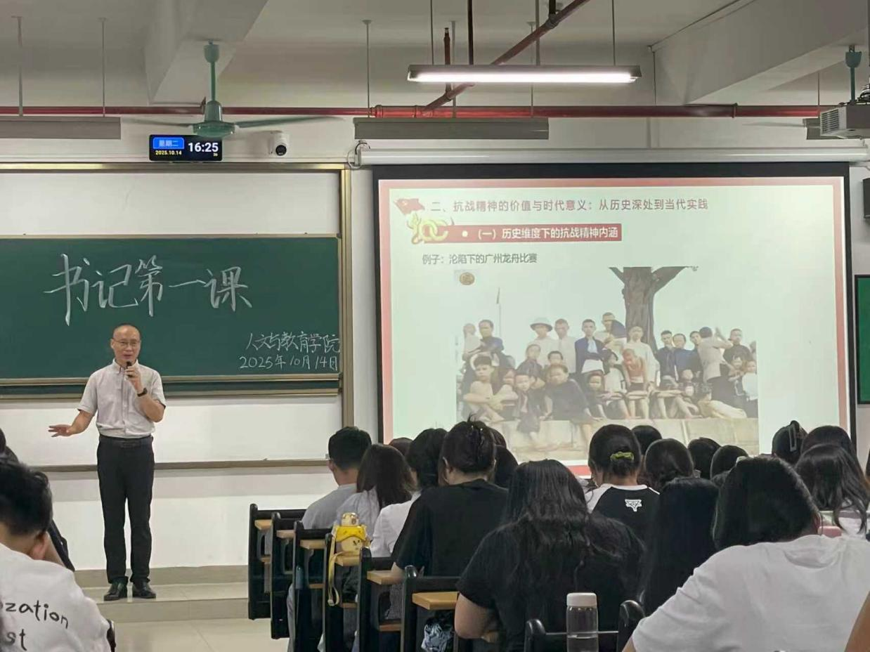 10月14日,suncitygroup太阳集团党总支于13号教学楼403教室开展“书记第一课”思政教育活动。党总支书记陈武耕围绕“弘扬抗战精神,淬炼担当本领”这一主题,为全院师生呈现了一堂内容充实、意义深刻的思政课,旨在传承红色基因,强化师生的家国意识。