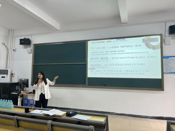 韩艳洁博士观摩课的主题是《现代汉语》的“文字”部分,从全球现有语言与文字的数量和种类开始讲起,与现场青年教师进行互动,活跃课堂氛围;由此引出作为表意文字的汉字,以简洁晓畅的语言、条理清晰的内容、深入浅出的教学方式,让大家轻松地掌握了关于汉字起源、特点及作用的专业知识。