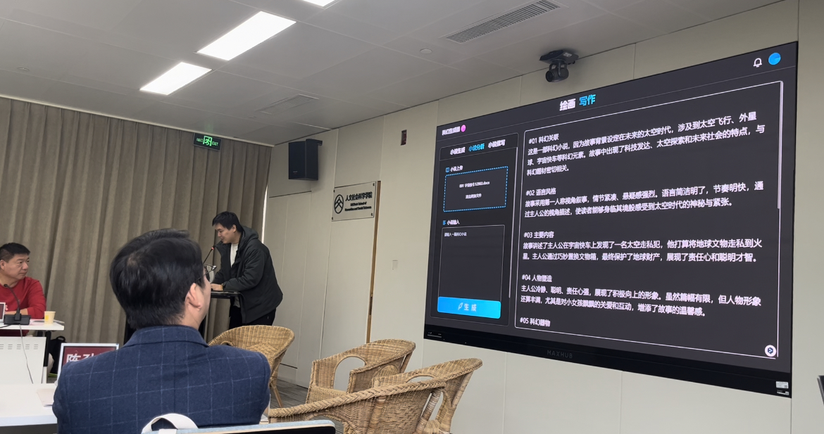 11月19日上午教学研讨会开幕式由南方科技大学人文科学中心副主任杨果副教授主持,人文社会科学学院院长(原北京大学中文系系主任)陈跃红院长、人文科学中心副主任田松教授先后致辞。开幕式后,中国写作学会副秘书长、理事宋时磊博士,南方科技大学讲席教授、树礼书院院长李蓝教授,南方科技大学教授、博士生导师吴岩教授联合南方科技大学科学与人类想象力中心研究员许秋斌等学者分别作了大会学术报告。吴岩教授和许秋斌研究员联合做的报告《采用大模型辅助科幻写作教学的设想和尝试》第三部分“AI科幻生成器1.0版”引起了在座教授们的极大兴趣,许秋斌研究院现场演示了如何用AI制作写作学会的LOGO,引起了在座教授们的热烈讨论,这也引发了大模型时代写作教育困境的探讨,现场碰撞出激烈火花。
