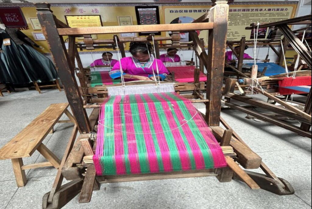 下午15:00-16:00,在吴老县长和石主席的带领下,教材编写组考察了广西区级非物质文化遗产——苗族织锦技艺的传承人唐巧英的工作坊。唐老师是中国民间文艺家协会会员,广西壮族自治区非物质文化产遗项目(苗族织锦技艺)代表性传承人,从事传统苗族织锦技艺40余年,是家族第四代传承人。出生在苗族织锦文化世家,从小热爱织锦,8岁时跟随祖母和母亲学习苗族织锦制作手工技艺,16岁学成出师,在当地已小有名气。为传承和弘扬苗族织锦文化常年免费培训学员。在工作坊织锦现场,唐老师热情洋溢而生动形象地根据织娘们的织锦给教材编写组的老师们详细地介绍苗锦的制作过程。在讲述的过程中,还不时插入一些民间故事。唐老师通过民间故事告诉了我们织锦花纹的由来,比如芦笙柱的锦鸡,是一个尾部羽毛较长的鸟,形似凤凰。