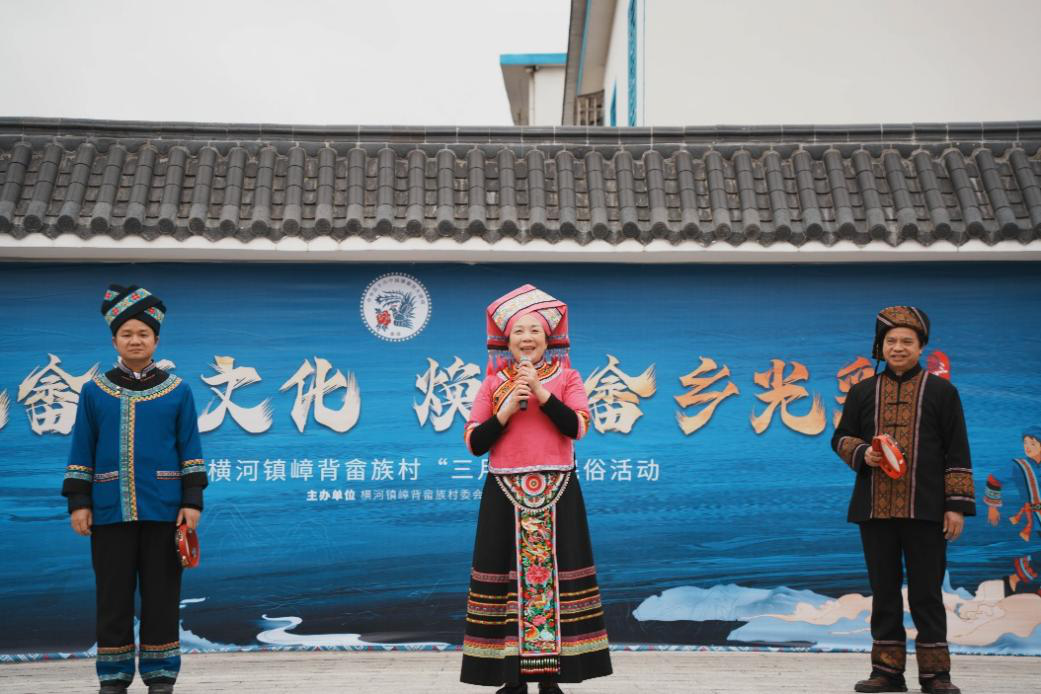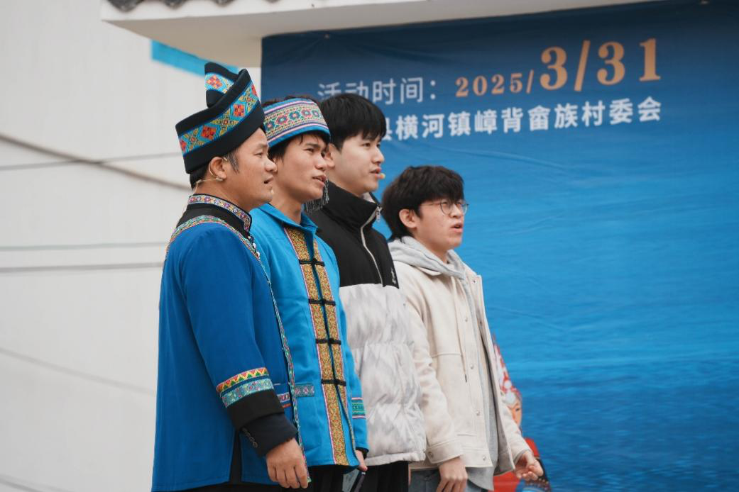 揭牌仪式后,师生们身着民族盛装,与畲族同胞共庆“三月三”。学院覃守达教授、《三月三》杂志原总编覃祥周先生及其爱人韦淑英女士所组成的壮韵组合,以一曲《三月三来共欢乐》献唱“三月三”民俗活动,清亮的歌声与悠扬的鼓声交织,传递“以歌会友”的淳朴情谊;随后覃守达教授携岭南民族民间艺术美育协会的七名同学,表演了《壮家敬酒歌》《刘三姐对歌》,引得现场村民击节相和。台下的畲族观众感慨:“大学生唱的山歌有新意,但骨子里的热情和我们年轻时一模一样!”
