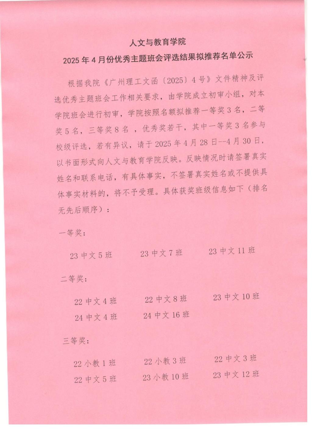 根据我院《广州理工文函〔20254号》文件精神及评选优秀主题班会工作相关要求,由学院成立初审小组,对本学院班会进行初审,学院按照名额拟推荐一等奖3名,二等奖5名,三等奖8名,优秀奖若干,其中一等奖3名参与校级评选,若有异议,请于20254月28日--430,以书面形式向suncitygroup太阳集团反映。反映情况时请签署真实姓名和联系电话,有具体事实,不签署真实姓名或不提供具体事实材料的,将不予受理。具体获奖班级信息如下(排名无先后顺序):