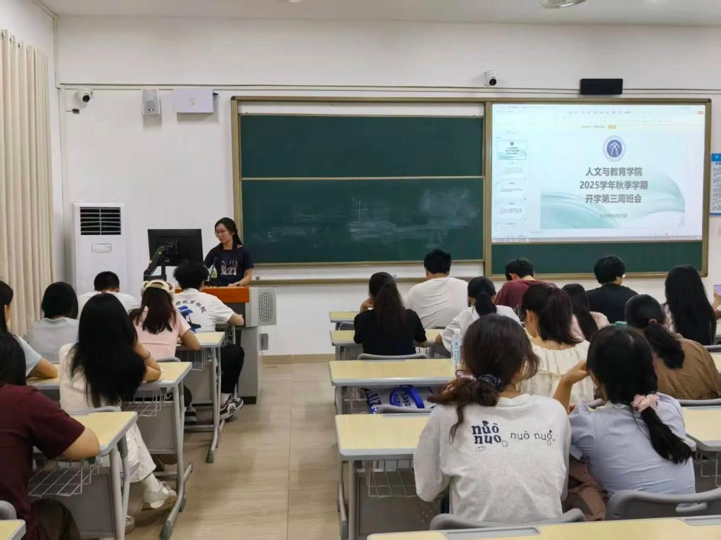 学生事务传达部分,班委逐项落实学校要求:一是2025级新生需在9月28日前完成“312”学生养成教育工程好习惯项目选择;二是全体学生须于9月28日前通过学工系统填写国庆假期行程去向问卷调查;三是各班级需配合学院,在10月9日前完成9月份主题班会活动申报材料的提交。
