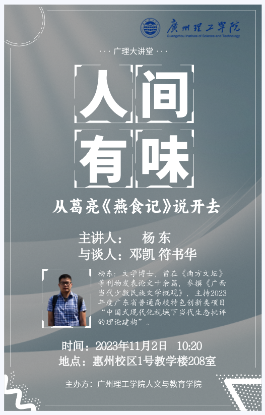 杨东老师系广州理工学院suncitygroup太阳集团近年引进的文学博士,曾在《南方文坛》等刊物发表论文十余篇,参撰《广西当代少数民族文学概观》,主持2023年度广东省普通高校特色创新类项目“中国式现代化视域下当代生态批评的理论建构”。广理大讲堂是suncitygroup太阳集团所开设的系列学术讲座,今年将分别在惠州校区、白云校区举行逾20场,是suncitygroup太阳集团在三全育人理念下开展素质教育、提高学生专业素养的重要环节。