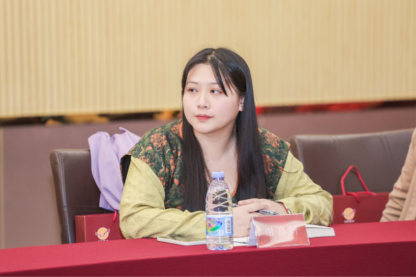 在会议发言环节中,身穿宋锦香云纱唐背子的谢嘉妍老师就香云纱在非物质文化遗产的地位及其在文旅产业链上的作用,以香云纱汉服为切入点进行发言,她详细介绍了香云纱面料的特性、产品迭代的途径及措施,她还展望了香云纱在新时代纺织行业与文旅产业融合中的文化属性及其市场前景。