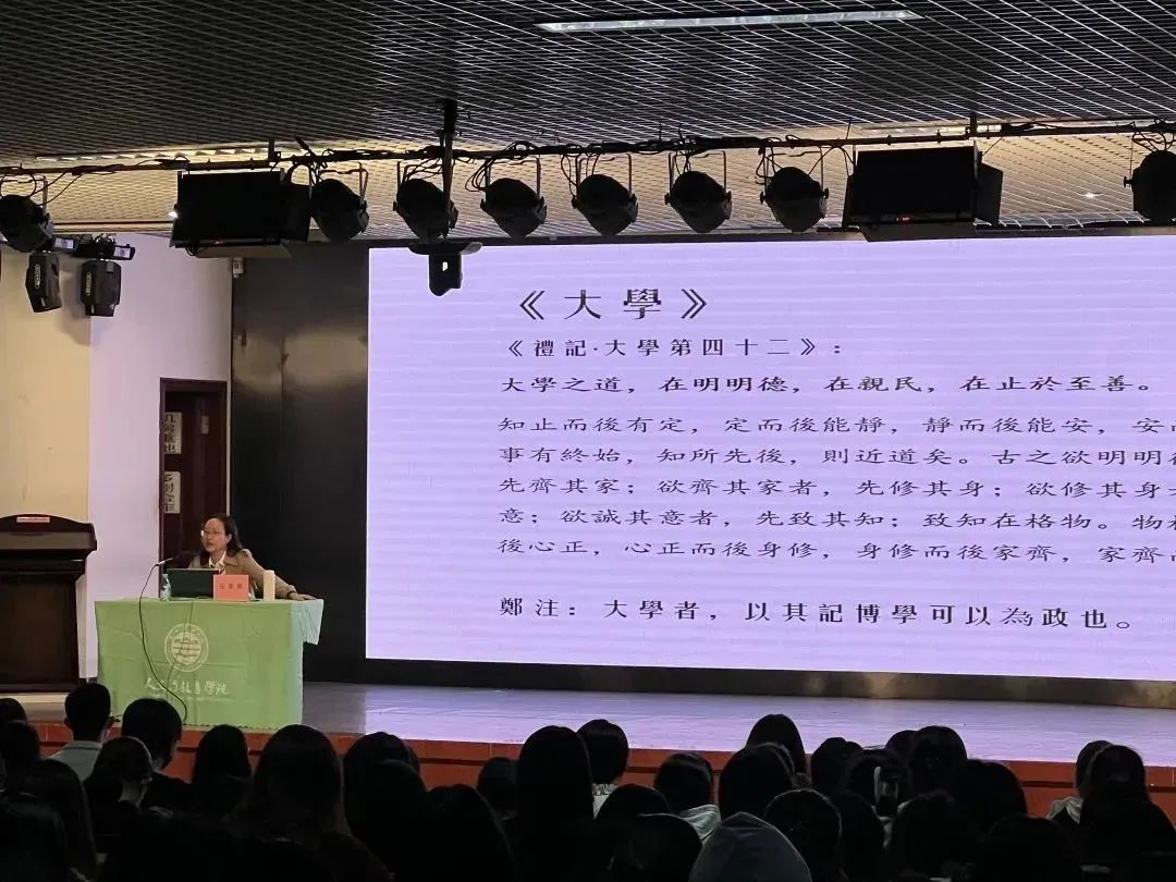 汪博士以“大学之道,在明德,在亲民,在止于至善”开场,明晰了东方文化从古至今对德行与修养的追求。她告诫当代大学生应当丰富自身、心怀天下、拥有崇高的理想与修身、齐家、治国、平天下的追求。汪博士对“四书五经”的概念及其范围也进行了阐述与补充。她表示,中华优秀传统文化以其惊人的生命力与丰厚的文化内涵,使其在历史之神的考验下仍存有中华风韵,在现代的今天仍对个人人格的养成发挥着巨大的作用,更使得国家治理之路政治清明,社会和睦。最后,汪博士深刻地阐述了“四书五经”的历史意义与启示。她强调,“四书五经”是近代教育改革与经学的式微,它为往后文学著作的书写样式甚至政治的发展提供了一定的遵循。除此之外,它还蕴含着东方文化的生命智慧,是国民性的体现与民族之魂。中华文化得以生生不息并于此刻仍能薪火相传,一脉相承,“四书五经”发挥了不可磨灭的作用。