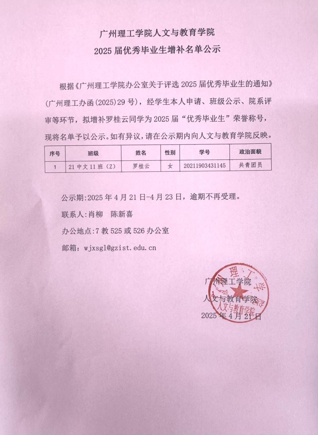 根据《广州理工学院办公室关于评选2025届优秀毕业生的通知》(广州理工办函(2025)29号),经学生本人申请、班级公示、院系评审等环节,拟增补罗桂云同学为2025届“优秀毕业生”荣誉称号,现将名单予以公示。如有异议,请在公示期内向suncitygroup太阳集团反映。