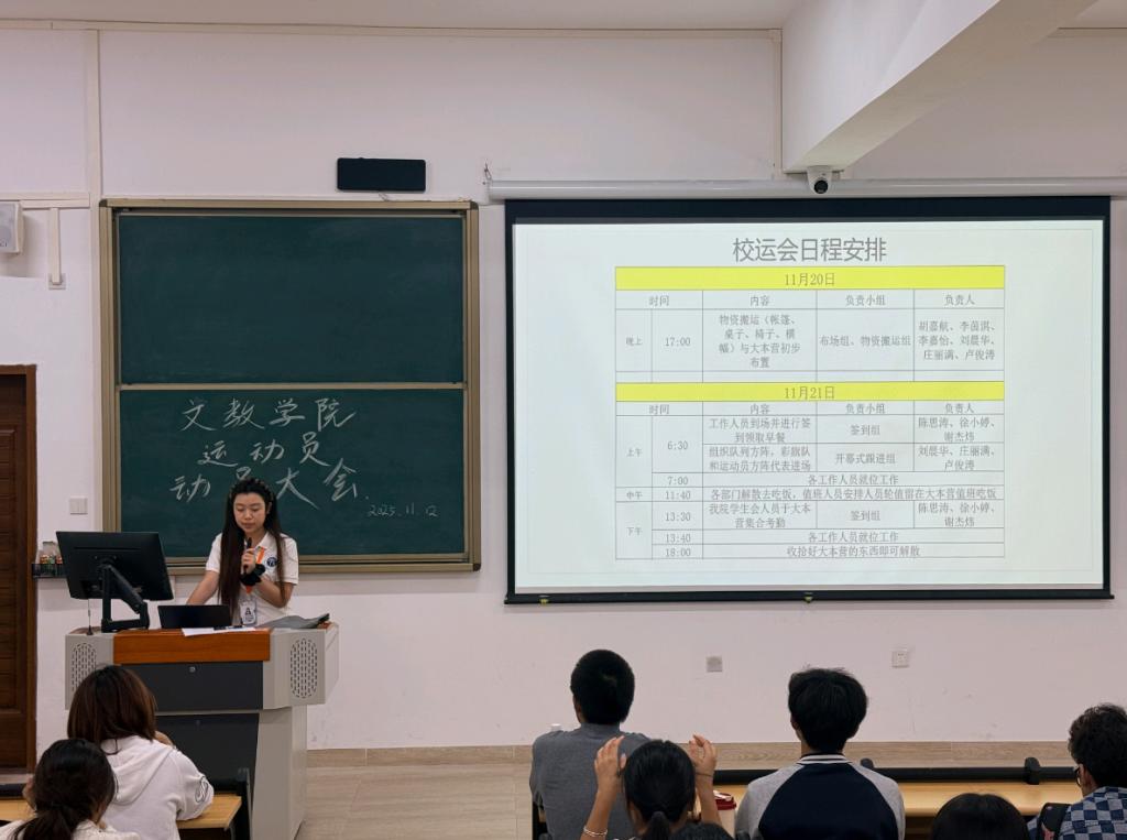 大会伊始,文体艺术部副部长陈宪嫣明确了惠州校区校运会的安排,指出赛事将于第11周(11月21日至22日)举办,团学也已组建好十个专项小组负责全方位保障赛事顺利开展;接着她对运动员提出要求:既要配合工作人员做好赛前信息核对与流程对接,也要提前半小时到检录处检录,同时可依托大本营解决各类求助需求;最后她提醒全体人员注意赛事安全,现场工作人员会随时提供帮助。