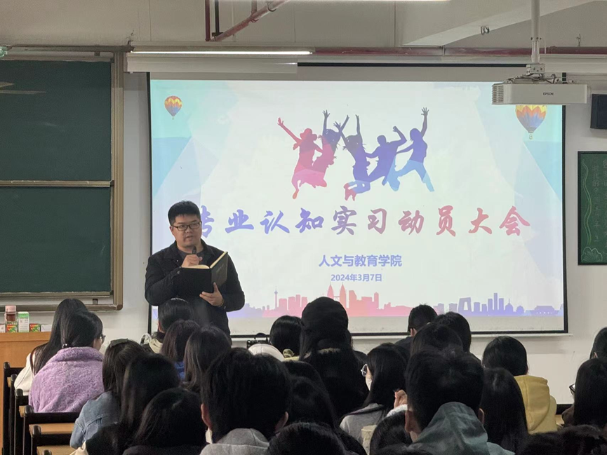 为落实我院小学教育专业人才培养方案,促进学生知行合一,理论与实践相结合。我院21级小学教育专业各个班级将在3月11日-3月29日前往广州理工实验学校参加专业认知实习活动。7日下午,我院在13栋501召开2023-2024第二学期21级小学教育专业认知实习动员大会,本次大会由实习指导老师张丽娜主持,出席本次会议的有suncitygroup太阳集团副院长杨东,教育系主任黄静,指导老师马天翼、马会媚、钟正美,辅导员石淳,以及小学教育专业170余名同学共同参加本次动员大会。
