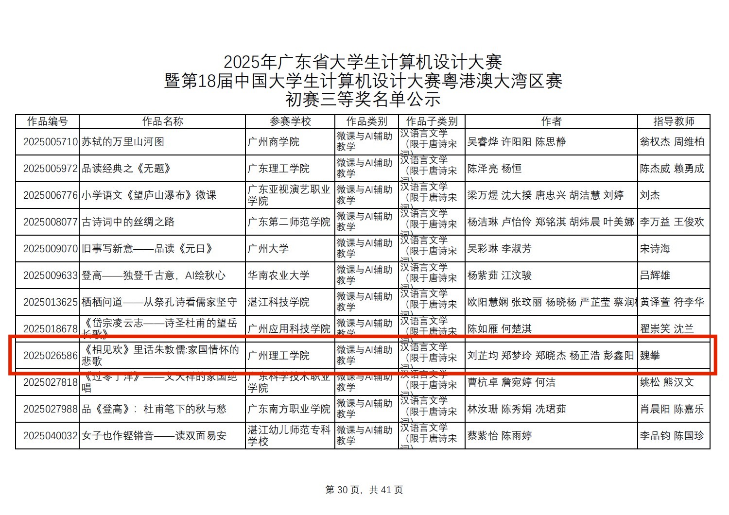 近日,2025年广东省大学生计算机设计大赛落下帷幕。在广大师生的热情参与下,今年共有139所院校组织校级赛选拔,共推荐了4666件作品参赛,各赛道分别进行初赛评比。其中传统赛道共有493件作品获得三等奖,有366件作品入围决赛。此大赛作为省内计算机领域极具影响力的赛事,聚焦多元赛道,为高校学子搭建展现数字创意与技术应用能力的平台。其中“微课与AI辅助教学”赛道,以推动教育数字化、创新教学资源开发为目标,吸引众多高校参赛。大赛自启动后,历经作品征集、初审、复评等环节,竞争激烈。