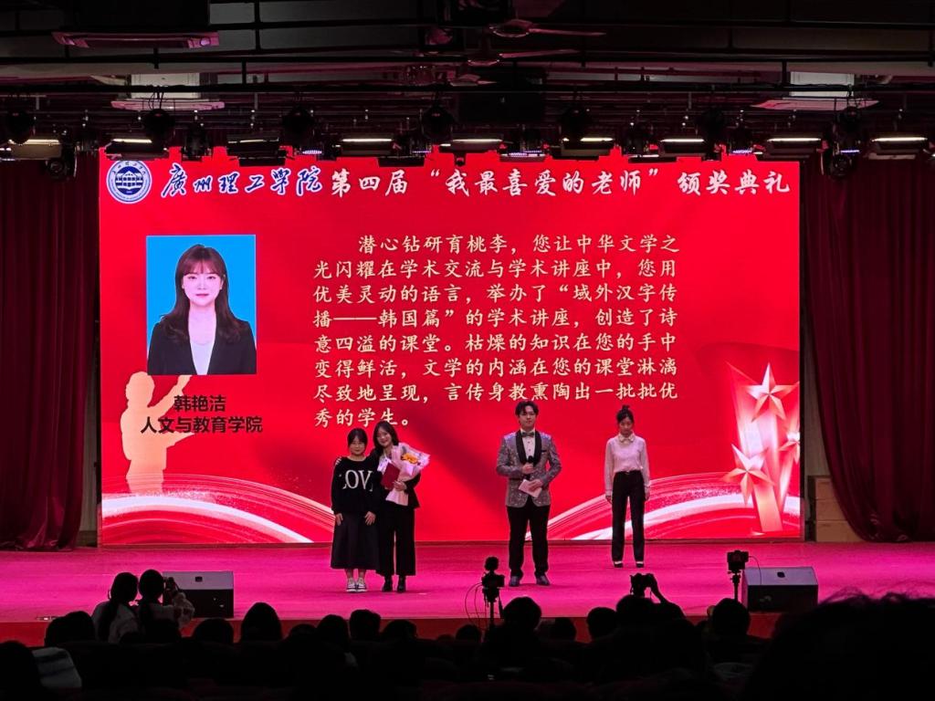 广州理工学院第四届“我最喜爱的老师”颁奖典礼于2023年12月28日下午3点30分在1号报告厅隆重举行,我院教师韩艳洁荣获此项殊荣。