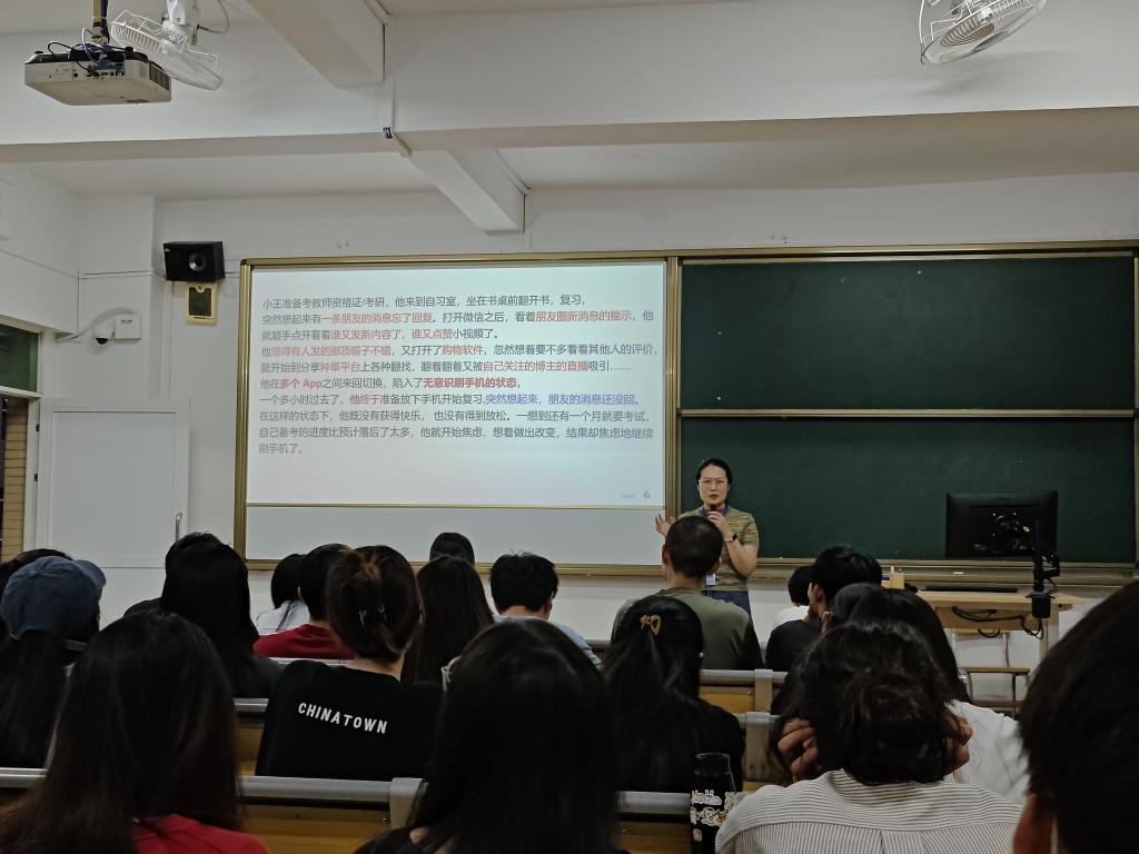 随后董老师尝试分析了软成瘾背后的成因,如小组作业、某场考试、关系冲突等近因;大环境不确定性增加,就业压力变大等远因;软成瘾行为具有的简单、即刻反馈的特性等。为了帮助同学们克服“软成瘾”,董老师还提出了一些实用的替代办法,如去公园亲近大自然、云陪伴云倾听、深度的友谊和亲密关系、列小目标循序渐进等。