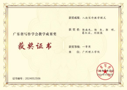 在本次大会中,我院分别斩获“教学成果一等奖”和“优秀组织单位”两项大奖。充分展示了我院在写作教学领域的实力和风采。其中教学成果奖中提出的“八诀写作教学模式”是近年来在我院科研副院长、广东省写作学会副会长陈南先教授、特聘副教授郭明、教学副院长杨东等人的主持、推动下完成的。稍早前介绍我院“八诀写作”的深度报道——《广州理工学院“放大招”破解写作难题》在中国网客户端阅读量突破了百万,创造了我院形象宣传的一项神话与奇迹。这次省写作学会年会一结束,《中经在线》介绍我院写作教学经验的深度报道——《诀,真绝!“八字写作教学模式”获奖了!》,再次引起广泛关注,阅读量再次突破100万+!“八诀写作教学模式”,即游、学、思、写、改、刊、奖、译,犹如八颗璀璨的明珠,共同串起了学生写作能力提升的项链。我院的创意写作教学让学生们在游学中积累素材,在学习中深化理解,在思考中激发灵感,在写作中锤炼技艺,在修改中精益求精,在发表中展示才华,在奖励中增强自信,在编译中拓宽视野。