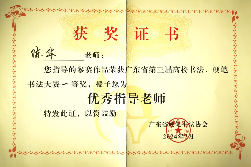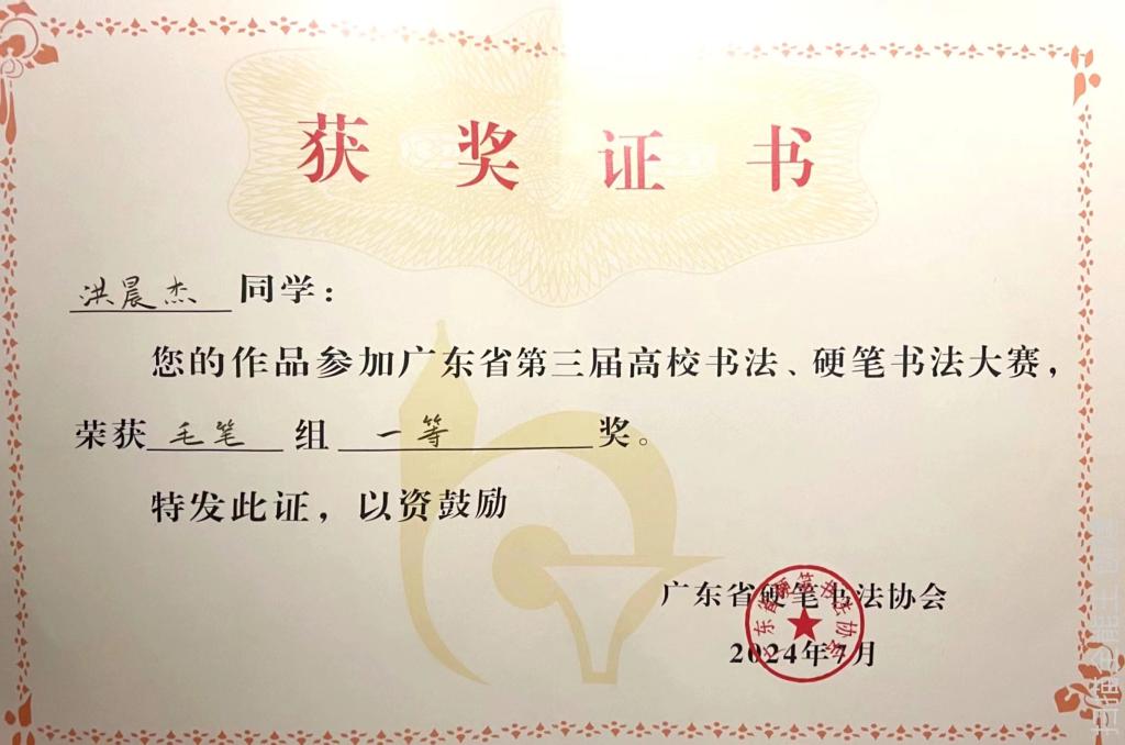 近日,我校洪晨杰同学(2021级机械设计制造及自动化1班)在广东省第三届高校书法、硬笔书法大赛中荣获毛笔组一等奖。指导老师是suncitygroup太阳集团的陈华老师。