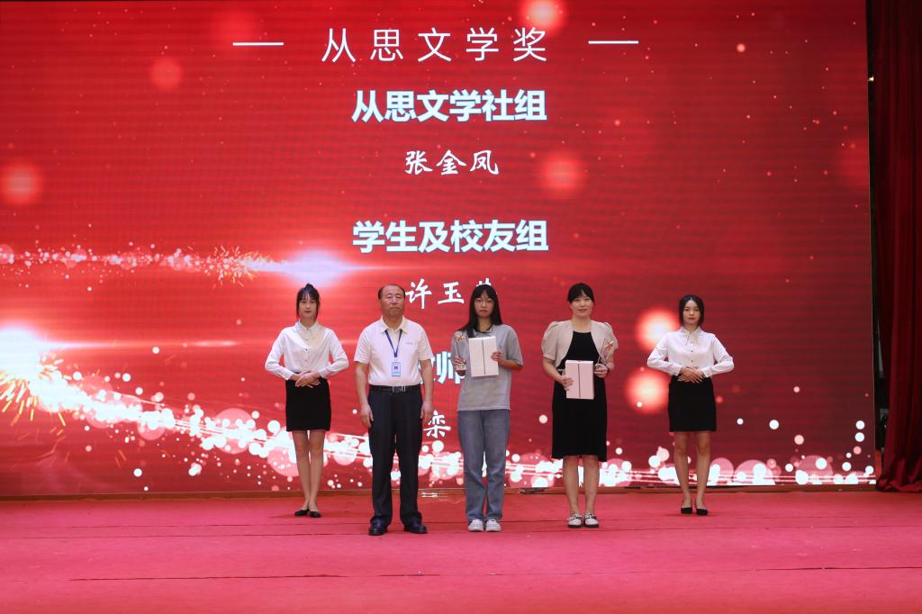 6月2日,凤凰花开,诗书畅怀。学校举行第一届“校友杯”征文大赛颁奖礼,优秀校友汇聚母校,与良师益友畅叙情谊,与学弟学妹共勉未来。来自22汉语专业8班的许玉莹、音乐舞蹈学院教师栾鸾和从思社员、22汉语3班的张金凤捧得最高奖“从思文学奖”,17国贸校友李曼洁、智电学院荣休专家周永海教授和从思社员、21英语2班的单慕晨获得一等奖,另有6人获得二等奖,18人获得三等奖,22人获得优秀奖。常务副校长伏焕昌和党委副书记、副校长肖海等党政领导出席并颁奖。校友们为获奖师生准备了精美的奖品,包括奖杯、ipad、耳机、购书卡、读书卡、中外名著等。