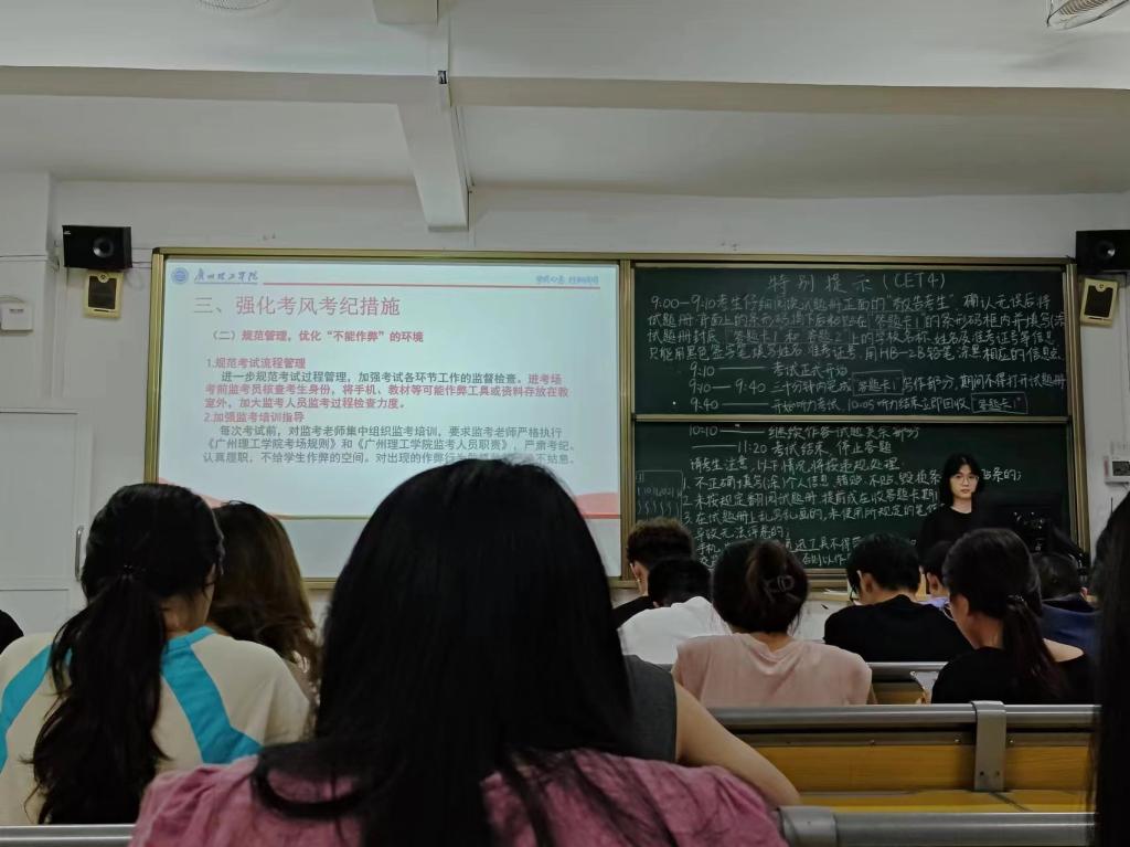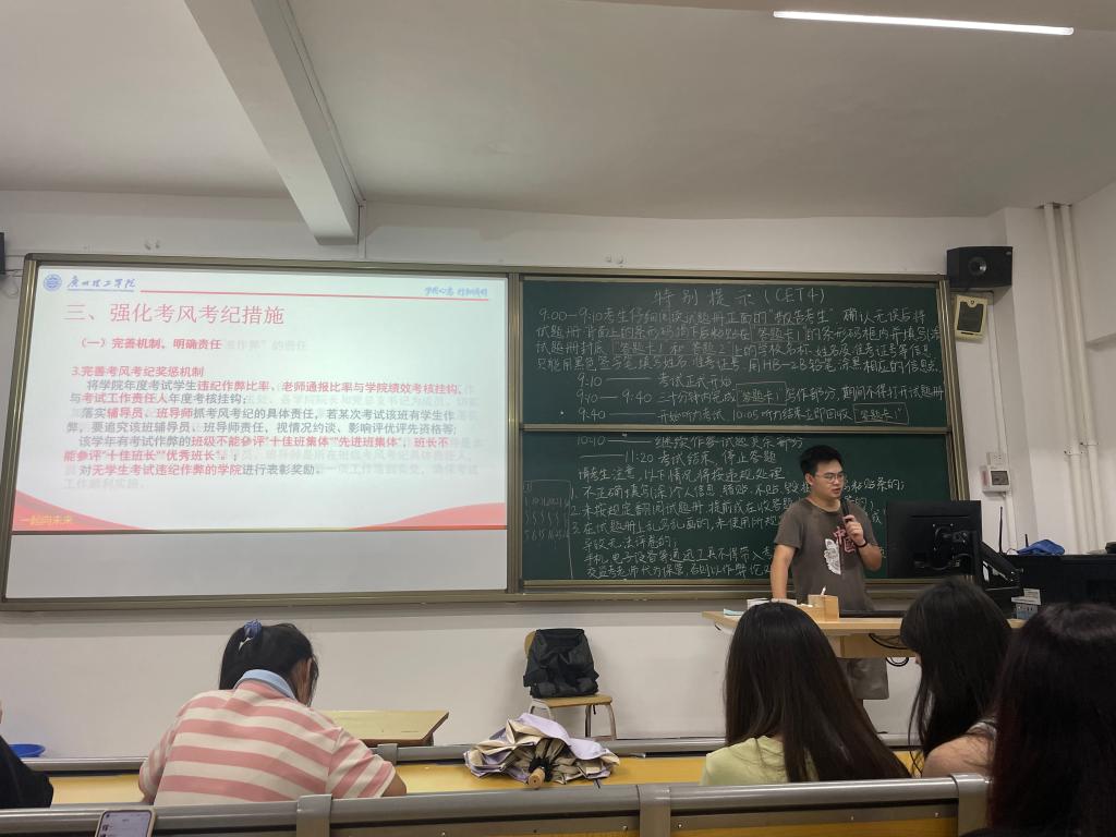 其次,班委公布2023-2024学年第一学期各学院的考试作弊人数、处分等级及主要形式。此举旨在告知学生作弊被抓的其后果严重性,以此告诫学生万不可触及作弊红线。同时,辅导员也强调了学院对于作弊行为的零容忍。然后,班委讲述了学校关于强化考风考纪的各项措施。学校分别从完善体制机制、优化考试管理、加强思想教育以及严肃处理作弊者四个方面来强化考风考纪,从学生层面、老师层面、技术层面等多个维度强化考风考纪。接着,班委仔细讲解了对于学生考试违纪的处理办法,将考试违纪、作弊行为的认定,违纪、作弊行为的轻重程度、违纪、作弊行为的处理办法等进行详细说明,并强调了一旦考试中有相关行为,轻则进行警告处分,重则直接留校察看。