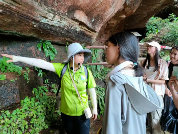 在参观完博物馆后,导游带领同学们走出户外,参观室外的景点。同学们在导游的带领下先后参观了锦石岩寺、仙居岩道观、别传婵寺等景点,同时,导游也实地跟同学们介绍了丹霞山景区的独特物种,同学们通过导游的实地讲解,触摸植物、对丹霞山景区的独特物种也有了更深入的解。