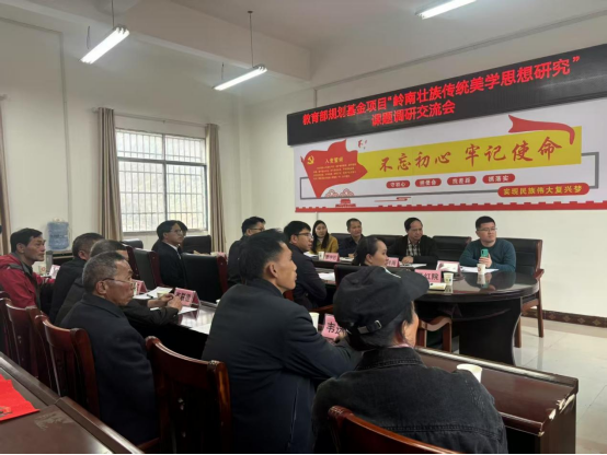 当天下午,调研组与巴畴乡党委书记、乡长等当地领导召开了教育部规划基金项目“岭南壮族传统美学思想研究”(巴畴)调研交流研讨会。党委书记韦德夫详细介绍了巴畴乡在民俗文化传承与创新方面的实践与成果。作为国家级非物质文化遗产的传承地,巴畴乡依托深厚的民族文化资源,创新开展“一月一主题,一村一品牌”的农耕文化习俗活动,将蚂拐节、铜鼓文化等传统元素与现代旅游产业相结合,吸引了大量国内外游客,推动了当地经济社会的发展。