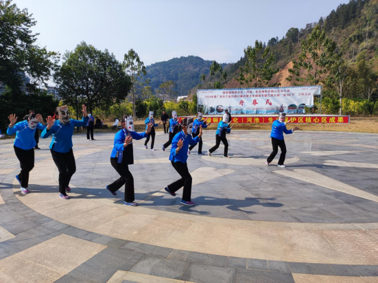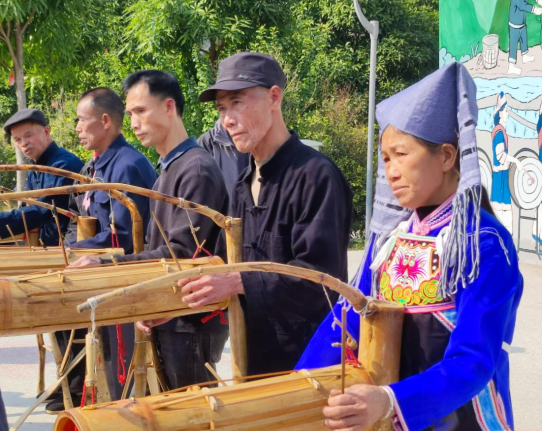 在巴畴乡政府的精心组织下,巴英村的村民为调研组带来了一场极具地方特色的民俗文化表演。表演包括蚂拐舞、铜鼓演奏、筒噔表演以及陀螺竞技等传统项目。蚂拐舞是壮族蚂拐节的核心仪式之一,舞者身着传统服饰,模仿青蛙的动作来跳舞,寓意祈求风调雨顺、五谷丰登,展现了壮族人民对自然的崇敬与和谐共生的理念。铜鼓作为壮族文化的象征,其深沉浑厚的鼓声不仅是一种音乐表达,更是壮族先民与自然、神灵沟通的重要媒介。这些表演不仅生动展现了巴畴乡的文化活力,也为调研组提供了直观的审美体验。