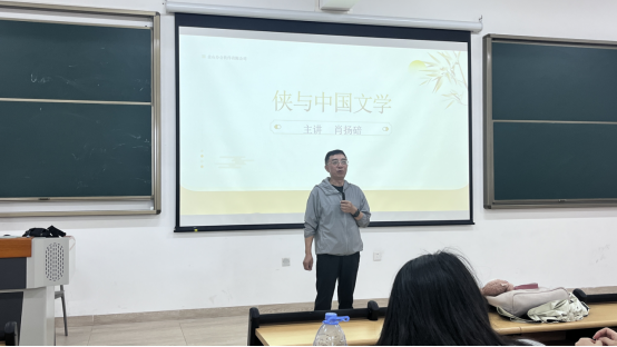 讲座以"侠文化"为核心,从历史、文学与哲学多维度展开剖析。肖老师首先解读了“侠”的精神内核——正直、重诺、扶危济困,并溯源至春秋战国的“士文化”,通过《史记·刺客列传》中荆轲、聂政等经典形象,展现古代侠者的家国情怀。在文学篇章中,他带领我们纵览曹植《白马篇》、李白《侠客行》的诗意豪情,解析《水浒传》《三侠五义》等小说中的侠义叙事,更以鲁迅、金庸作品为例,探讨近现代文学对侠文化的传承与创新。最后,肖老师辩证分析了侠文化中“以武犯禁”等理念与现代法治的冲突,强调在当代社会弘扬侠义精神的积极价值。
