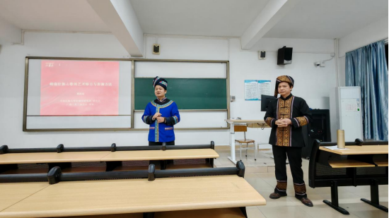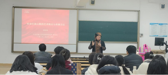 讲座进入尾声,覃守达教授做最后总结,他期望同学们在回味岭南壮族山歌的同时形成正确的审美认识,并希望山歌可以保留在我们的生活中,时刻带给我们美的享受。