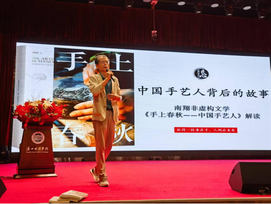 为深化学术氛围、增强学生对写作的认知,5月29日下午,广州理工学院白云校区3号报告厅内座无虚席,一场以 “非遗传承面面观 — 以《手上春秋——中国手艺》” 为主题的专题讲座在此举办,为现场师生带来了一场关于非遗技艺与文化传承的精彩盛宴。此次讲座是由科研管理部和suncitygroup太阳集团联合主办的,讲座特别邀请到了深圳大学文学院教授、文学创作一级、著名作家南翔教授担任主讲人,suncitygroup太阳集团陈南先副院长担任主持。出席本次讲座的还有科研管理部崔怀林部长、吕学勇老师、suncitygroup太阳集团陈群老师、昌中信老师、张方鸿煜老师。