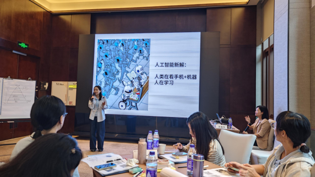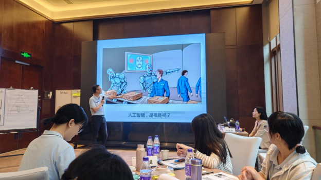 在后续“设计篇”与“实施篇”环节,关老师系统介绍了独具特色的“PECA教学设计模型”,即通过结构化设计(Programmed)、体验化模拟(Experience)、场景化连接(Connecting)和行动化应用(Action)四个维度,系统构建互动课堂。参训教师通过“GRIP游戏化体验”“开放画廊”“啊哈测试”等多种互动教学方法,体验了如何将知识传递转化为应用能力培养,在课堂中实现“学中做、做中学”。实施环节则通过小组实操与现场点评,助力教师精准改进教学设计方法。