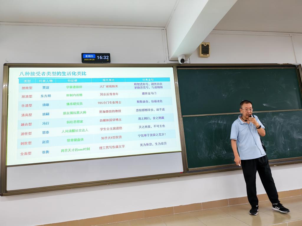 高教授制作表格将八种接受者类型进行生活化类比,成功吸引现场观众的眼球,透过现代模拟的特征梗,引起讨论和关注。张银霏老师点评时说:高教授说的八种类型的这些人我也都熟悉,他的思维表现在那两个表格,是年轻人才能做出来的表格,非常佩服高教授将汉代庄学应用于现代生活场景模拟思维,相当有梗!现场学生提问:庄子是无政府主义先驱吗?从学术角度分析可以把赵壹当成无政府主义先驱吗?高教授说:首先庄子是一个无政府主义者,无为就是彻底的无为。其次杨朱思想中的为我是先驱,庄子的思想中有杨朱的思想。学生又问:不生育是消灭痛苦的路径吗?高教授答:现代人是精致的利己主义者,许多人四十岁了不结婚,他说:结婚生子会影响我的生活水平,所以我不乐意!干脆就不结婚了!这在一些发达的资本主义国家常见,我国也应重视这个问题。