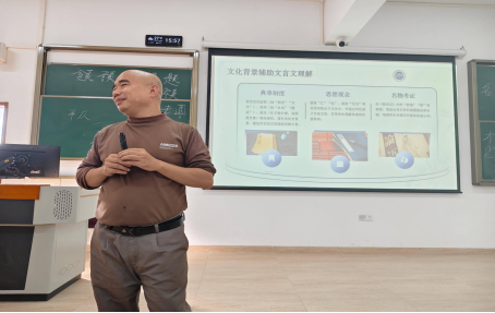 谢老师以文字小游戏:“如何用成语串起中国的历史”为讲座开篇语,谢老师用100多个成语将中国历史从盘古开天地的上古时代到孙中山领导的辛亥革命,画龙点睛地讲述了华夏五千年历经的沧桑与辉煌历史。谢老师从“古代汉语知识概述、古诗教学中的应用、文言文教学中的应用、汉字教学中的应用、成语与词汇教学中的应用”展开了古汉语知识的“正本清源”性的讲解。谢老师讲到,古代汉语广义上指五四运动前汉族使用的语言,包括口语和书面语:狭义上则特指以先秦口语为基础形成的文言文系统,如《论语》《史记》等经典文献的语言形式。其组成部分涵盖上古汉语、中古汉语及近代汉语,反映了汉语的历史演变脉络。古汉语主要知识包括了,文字学、音韵学、训诂学。在“通过音韵学解析古诗韵律”讲解部分,谢老师还分享了“《诗经》国风.秦风(兼葭)”的古音吟诵视频,视频音画似乎把人的思绪拉回到古时候,直接感受到古人的生活叙事和古诗词神形同在的仪式感。