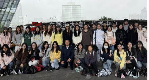 上午9时30分,大巴车平稳停靠在白鹅潭大湾区艺术中心广场。雨雾中,艺术中心现代风格的建筑线条更显柔和,同学们撑开红、蓝、黑等各色雨伞陆续下车,伞沿垂下的雨珠串成细链,在广场上形成一片灵动的色彩。“大家先集合,在馆门口拍张合照留纪念!”覃守达老师的声音穿透细雨,班委立刻组织同学们调整站位:有人悄悄理平外套褶皱,有人轻轻收起雨伞避免遮挡身旁同学,最终全班以白鹅潭大湾区艺术中心为背景站成整齐队列。随着手机“咔嚓”一声,同学们的笑容与雨雾中的建筑一同定格,成为此次非遗之旅的首个珍贵印记。