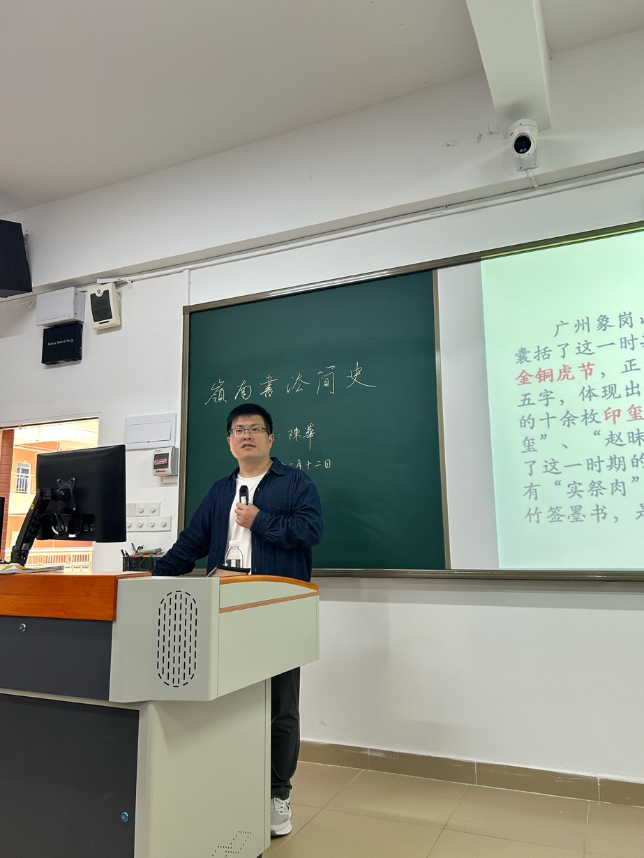 讲座伊始,陈华老师以广州理工学院“学用心志,行知诚明”的校训为引,指出书法艺术不仅是技艺的锤炼,更是“进德修业”、修身养性的重要途径。他从岭南书法的地域特色与“兼容并蓄、守正创新”的艺术特质讲起,系统梳理了从先秦肇始、唐宋蓄势、明清兴盛到近现代复兴的完整发展史。