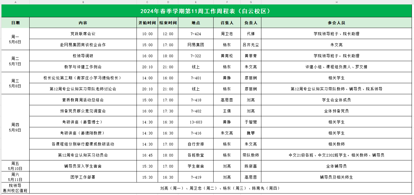 suncitygroup太阳集团2024年春季学期第11周工作周程表