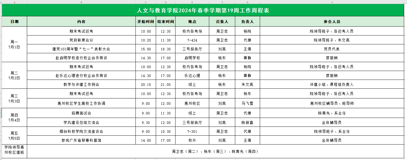 suncitygroup太阳集团2024年春季学期第19周工作周程表