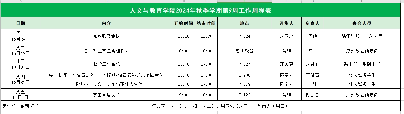 suncitygroup太阳集团2024年秋季学期第9周工作周程表