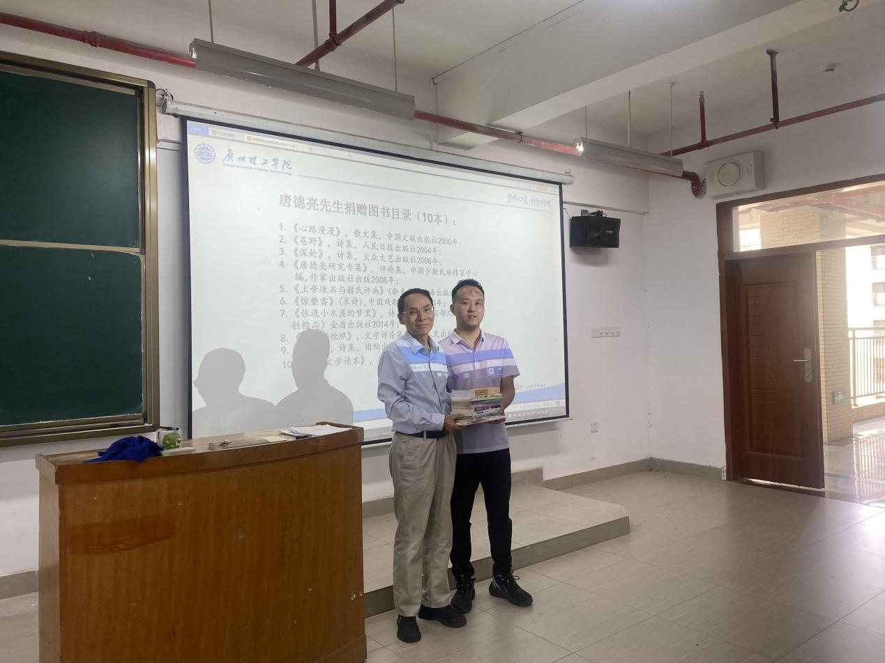 讲座正式开始之前,陈南先教授代表人文学院为唐德亮先生颁发了客座教授证书。唐德亮先生向图书馆捐了10套/本著作,余浩老师代表图书馆接受了捐赠。周武华副馆长给唐德亮先生颁发了捐赠证书。