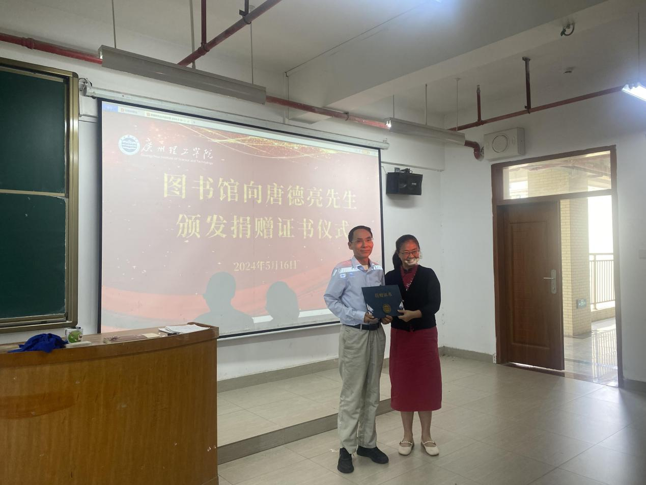 图书馆副馆长周武华为唐徳亮先生颁发捐赠证书