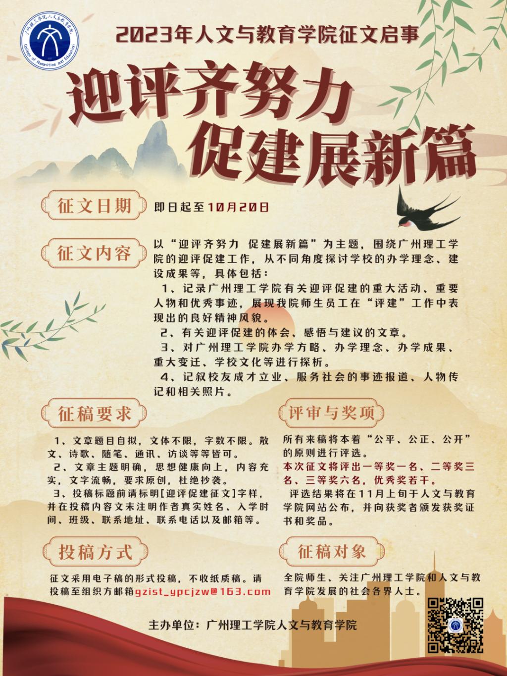 作为我校“迎评促建”工作相关的院级活动,此次征文以迎评促建为主题,采用线上征集方式开展。鼓励广大师生和校友围绕广州理工学院的迎评促建工作,从不同角度探讨学校的办学理念、建设成果等等。征文可以记录广州理工学院有关迎评促建的重大活动、重要人物和优秀事迹,展现学院学校师生员工在“评建”工作中的良好精神风貌;有关迎评促建的体会、感悟与建议的文章;也可对广州理工学院办学方略、办学理念、办学成果、重大变迁、学校文化等进行探析;还可以记叙校友成才立业、服务社会的事迹报道、人物传记。