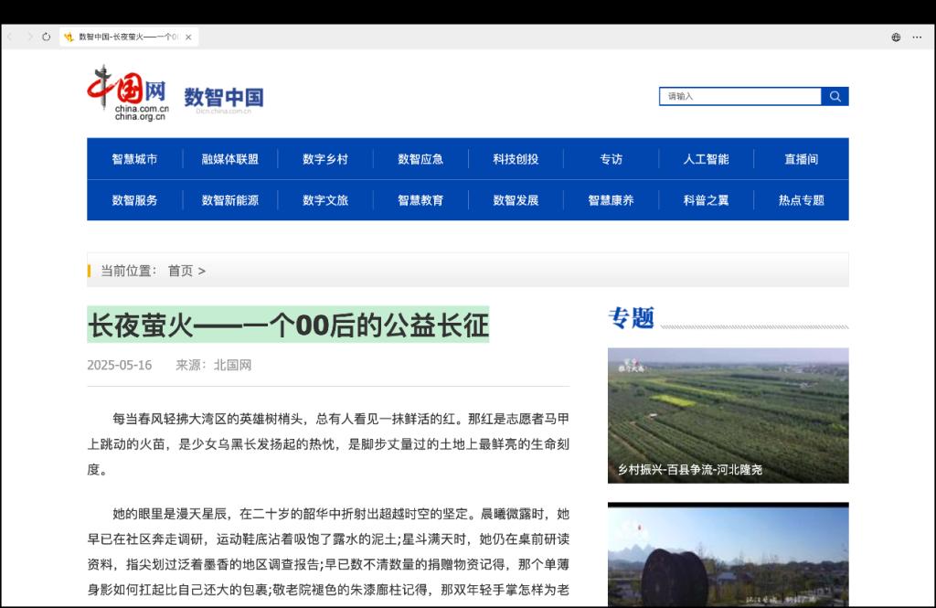 林恩淇同学9000字报告文学《长夜萤火——一个00后的公益长征》发表于2025年5月16日的中国网。