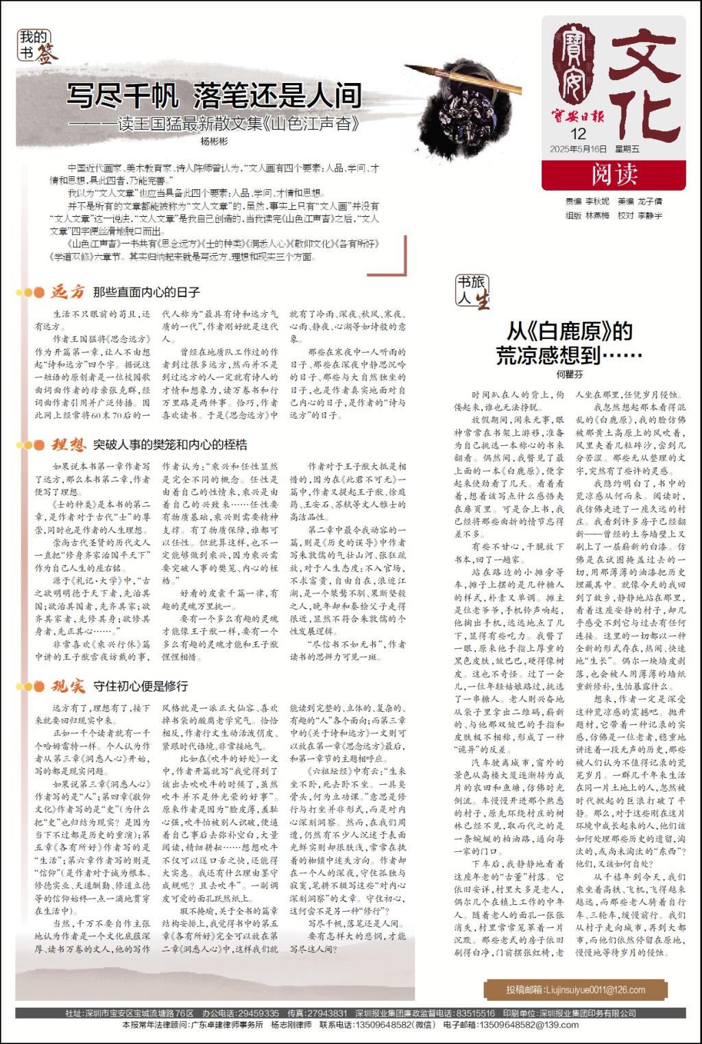何瞿芬同学散文《雨季里的外婆》发表于2025年3月21日的深圳宝安日报文化副刊;随笔《从<白鹿原>的荒凉感想到》发表于2025年5月16日深圳宝安日报文化副刊。