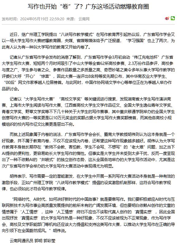 郭彩荧同学新闻作品《写作也开始“卷”了?广东这场活动燃爆教育》发表于2024年5月19日云南重点新闻网站“云南网”。